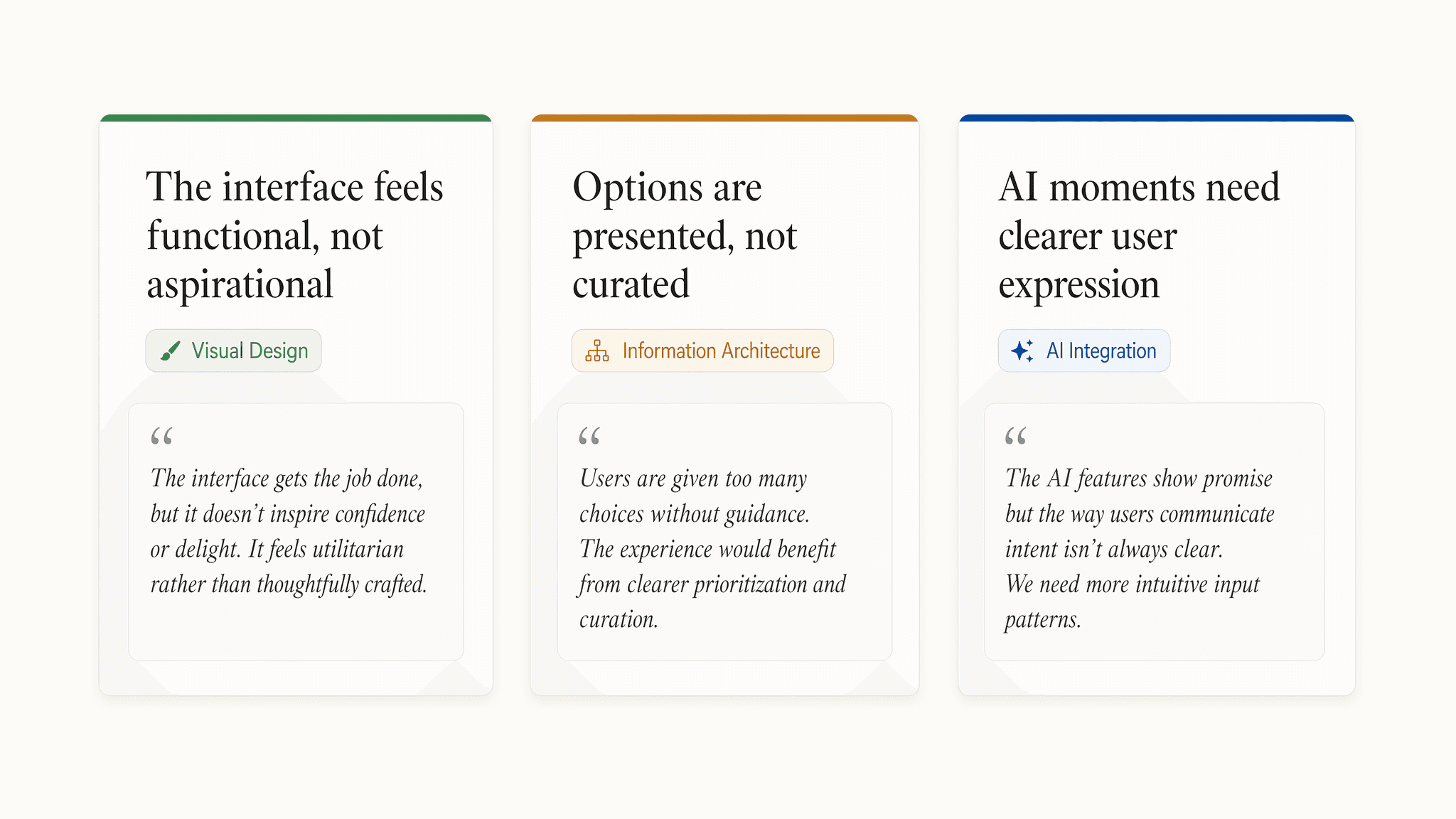 "the UX design and interface is a bit dated when it comes to visuals and color schemes." Higharc's own team acknowledged it publicly. Three opportunity areas emerged: visual design modernization, information architecture, and how AI moments are surfaced to the buyer.