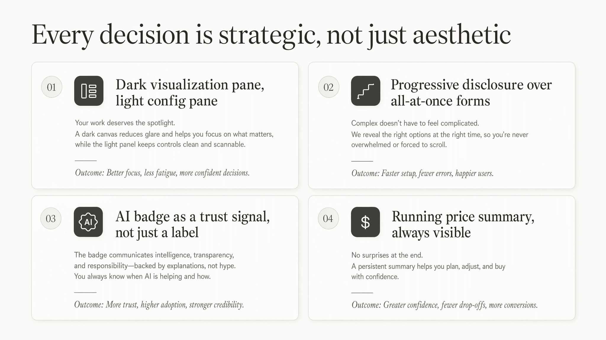 None of these decisions are cosmetic. Each one connects directly to outcomes. Higharc's business cares about — faster appointments, higher-margin option selections, fewer renegotiations, and a buyer who walks out the door with confidence instead of cold feet. Good design at the director level means being able to defend every pixel in business terms. This is how I think about every product I touch — whether it's an enterprise SaaS platform, a FinTech tool, or a homebuilding configurator I built on a Sunday because I genuinely want to work on problems like this.