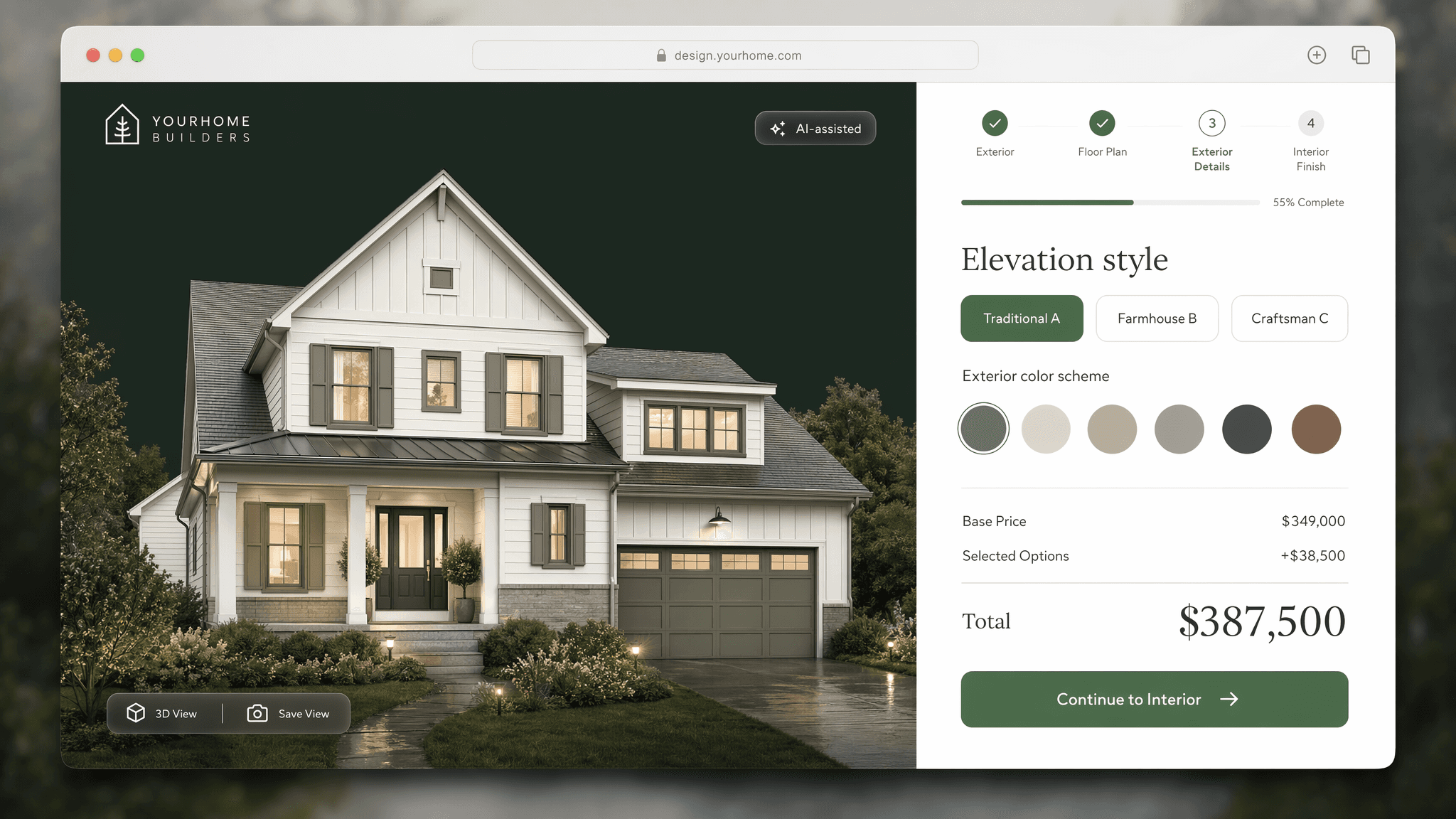 The proposed direction is built around one core insight: the 3D home is the most emotionally compelling element in the entire experience, so it should lead, not hide. A split-pane layout gives the live visualization 60% of the viewport, updating in real time with every selection. Dropdowns are replaced with chips and swatches: tactile, visual, and fast. A four-step progress system tells buyers exactly where they are and what comes next. A running price summary eliminates the anxiety of a final reveal. And an AI-assisted badge on the 3D view signals to the buyer that what they're seeing is accurate, buildable, and real.