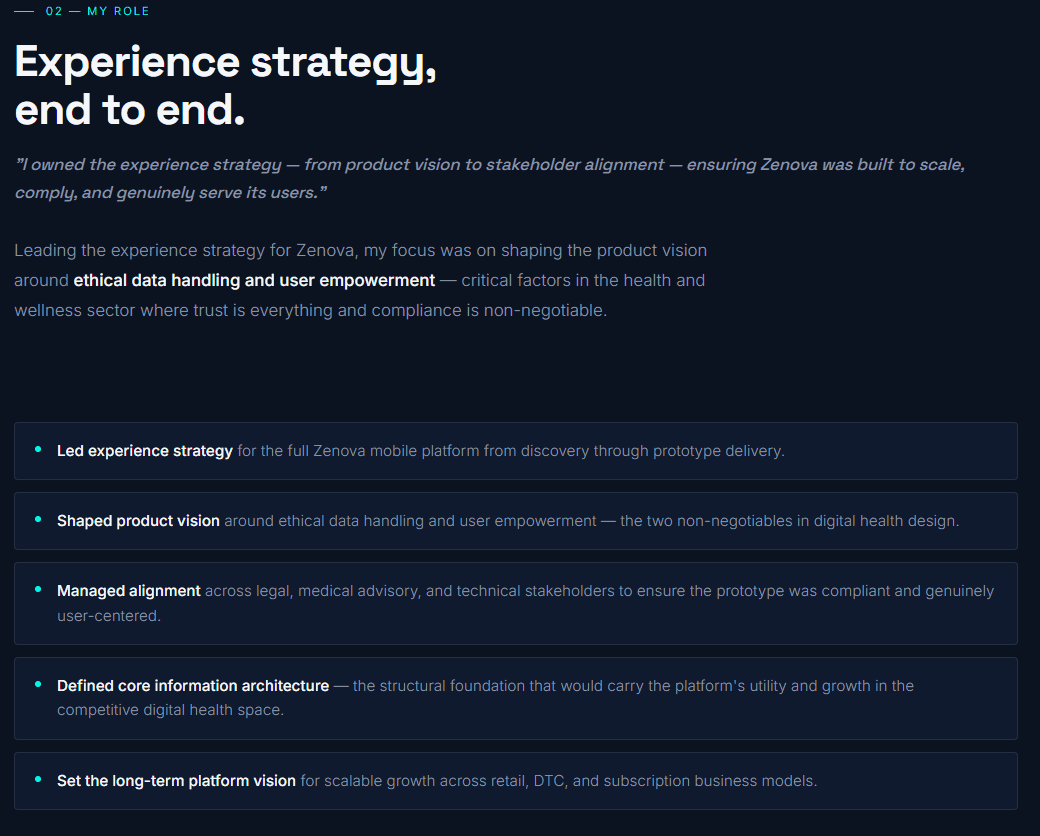 My Role: I owned the full experience strategy, from product vision to stakeholder alignment, ensuring Zenova was built to scale, comply, and genuinely serve its users.